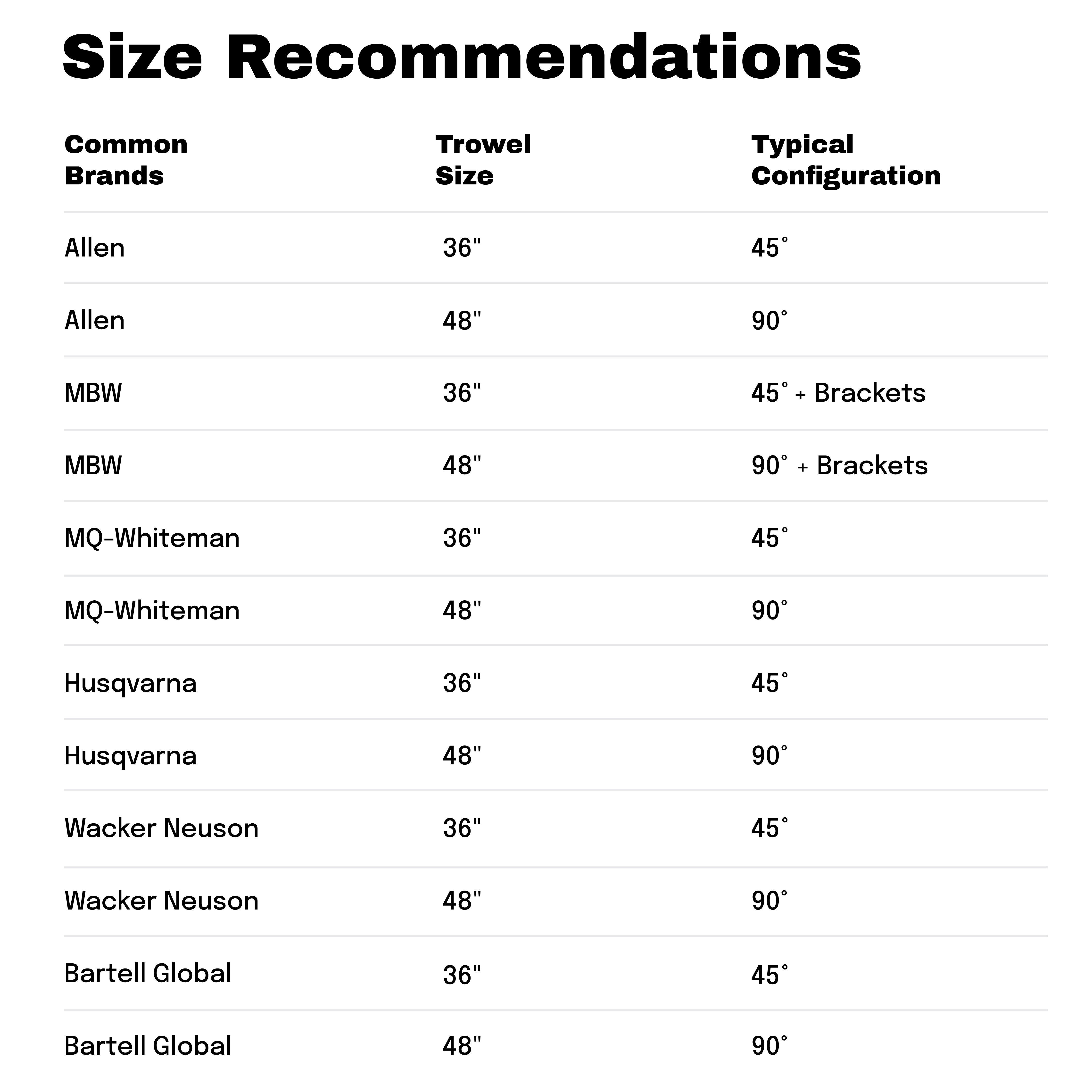 The full clearance 45° option is what we generally recommend for 3 foot power trowels. However, if clearance is not an issue, and you prefer center balanced transport, the 90° option will work very well on both 3 foot and 4 foot power trowels.