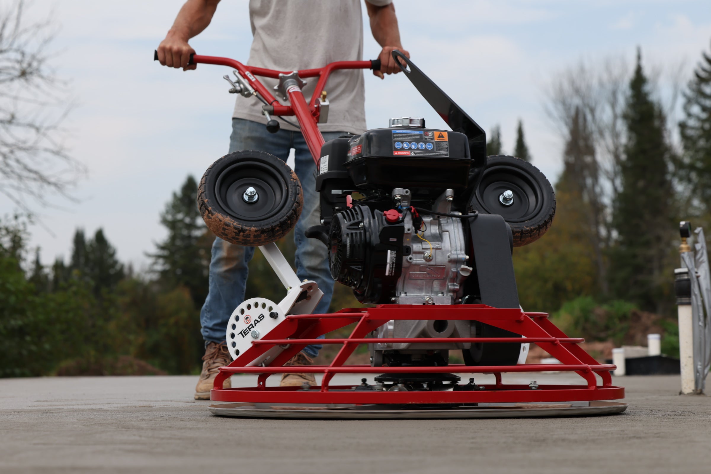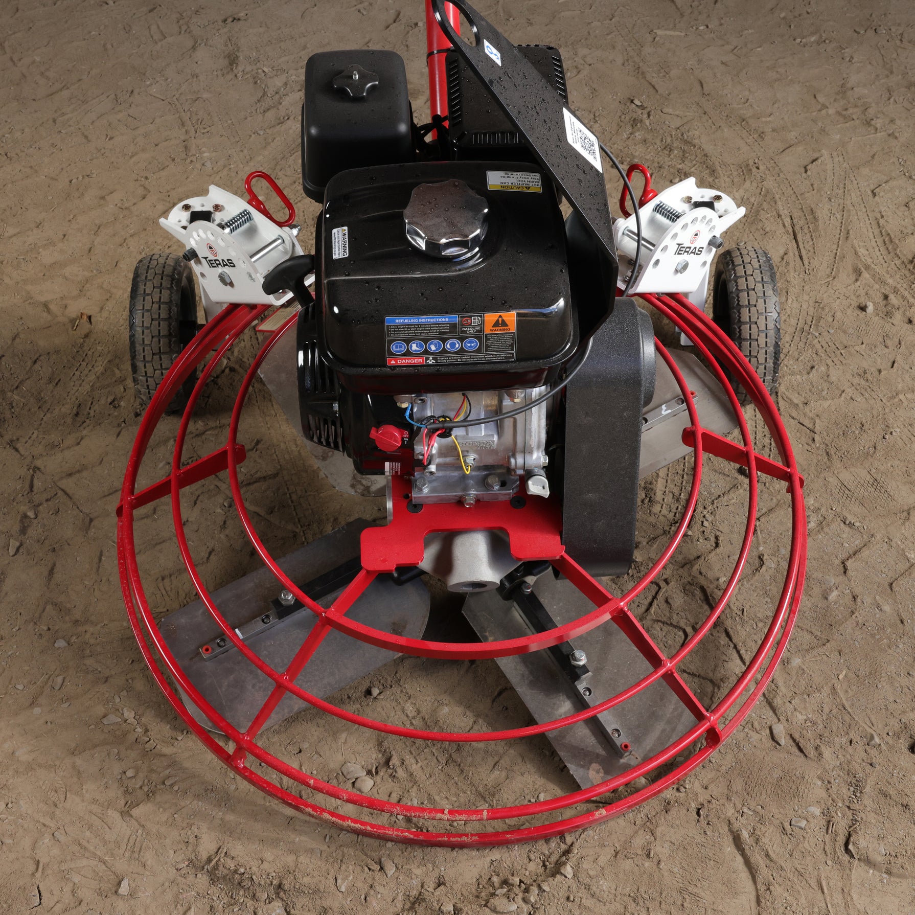 The 45-degree configuration angles the wheels rearward and has the benefit of keeping them about the same width as the trowel when deployed. They support the machine rearward of the center of gravity, and so work well on 36" trowels, which can often fit through doorway on construction sites.